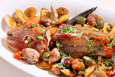 | 豪快!鮮魚丸ごと1匹! チェリートマトとアサリ、オリーブで煮込んだ “アクアパッツァ” Acqua pazza |